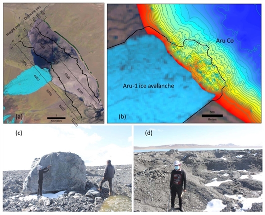 第一次冰崩在阿汝错产生的巨大湖啸(a),并将大量碎屑物质带入阿汝错,导致冰崩扇附近湖底地形产生显著变化(b);冰体融化后冰崩扇上留下的巨石(c)和大量碎屑物质(d)。