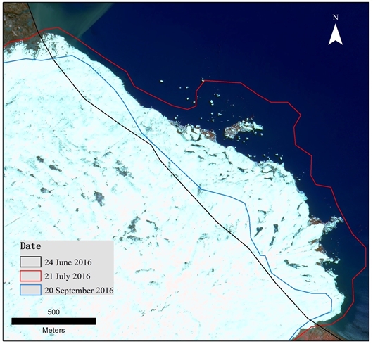 冰崩发生后大量冰体进入阿汝错 (图为第一次冰崩发生8天后即2016年7月25号的高分2号卫星图像)。