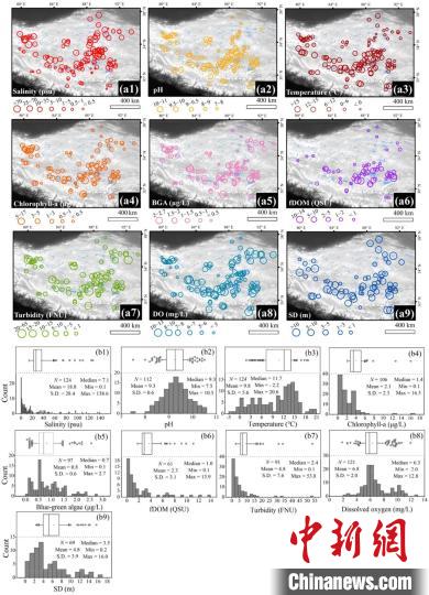朱立平介绍说,这次研究获取的实测水质参数涉及青藏高原124个封闭湖泊,总面积为24570平方公里,占青藏高原湖泊总面积的53%。研究团队通过对水温、盐度、pH值、叶绿素、蓝绿藻、溶解氧、荧光溶解有机质、浊度和透明度的分析,主要取得以下三项研究成果: