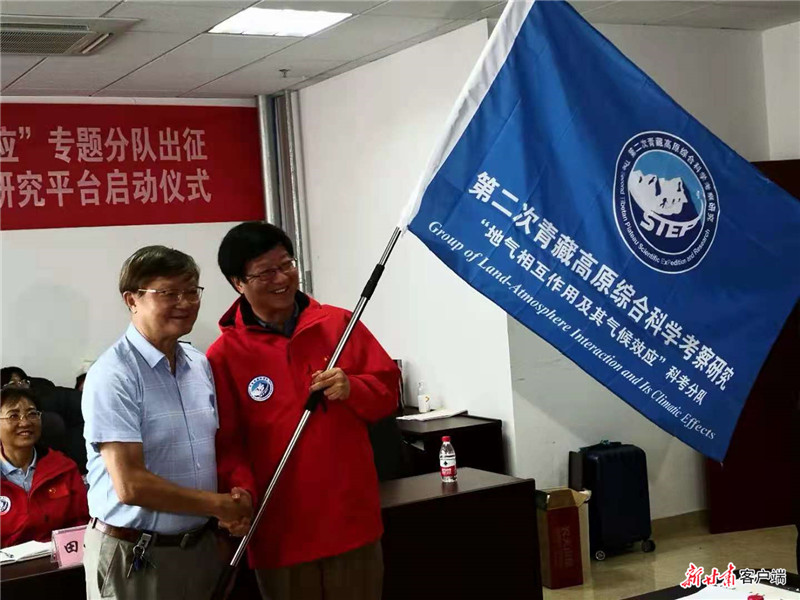 中国工程院院士徐祥德(左)为科考队授旗。