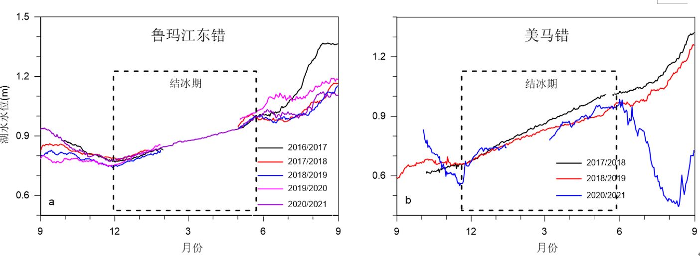 ▲冬季湖面结冰期鲁玛江东错和美马错湖水水位变化