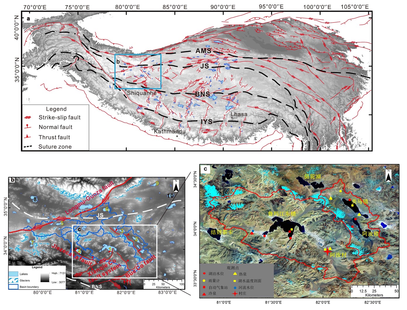 ▲研究区域地质构造图和湖泊水量平衡观测点位置