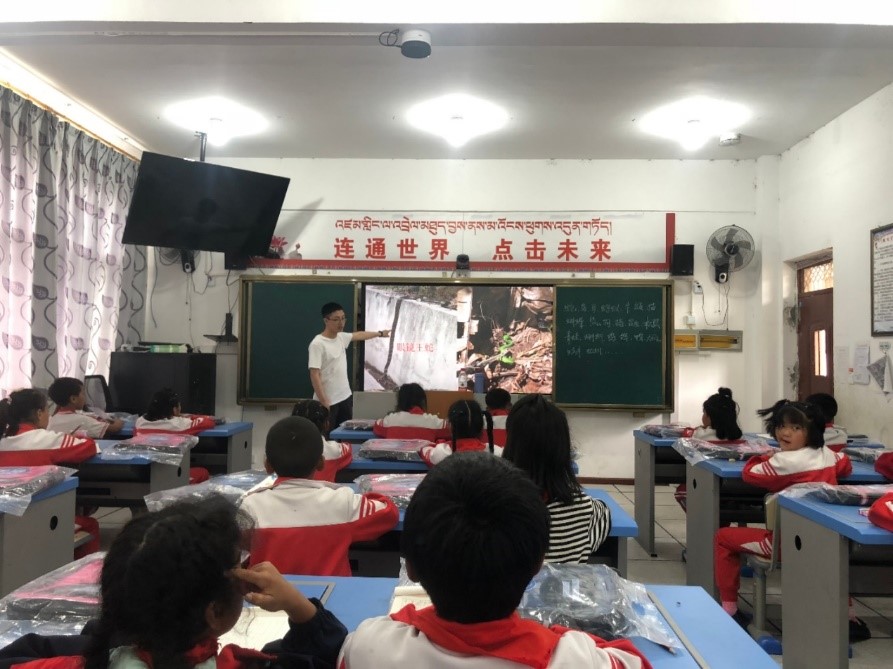 墨脱中心以科普进校园的形式组织本次公众科学日活动。观测主管赵旺林为在德兴乡小学30余名师生做了科普报告。介绍了多种墨脱常见动植物、分享了墨脱野外考察和生态保护工作经历。活动还为学校捐赠了学习用品,为校图书馆捐赠了科普书籍,获得师生的一致好评。