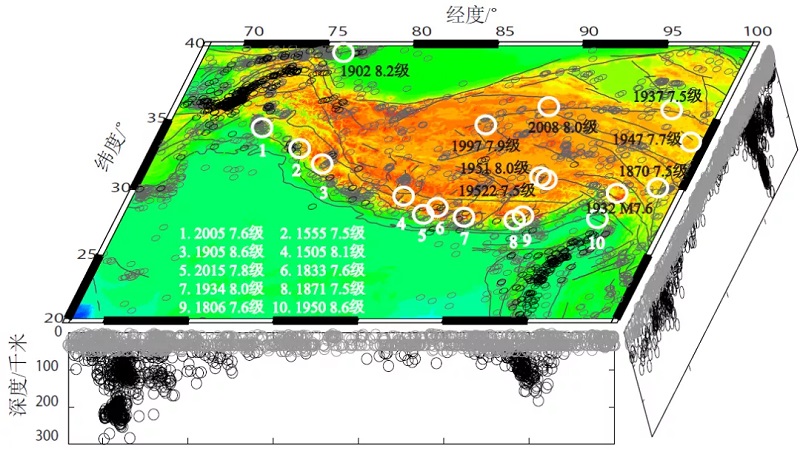 图2喜马拉雅-青藏高原地区发生的震级大于7.5级、深度小于70千米的地震