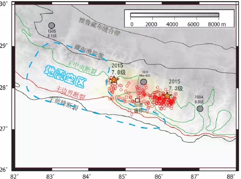 图3廓尔喀地震破裂区(余震所在的彩色区域)与地震潜在的尼泊尔中部地震空区(浅蓝色虚线区域)