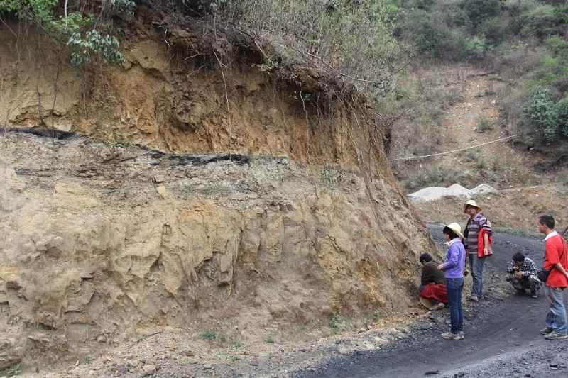 在云南省曲靖市沾益县蔡家冲村和剑川县双河煤矿附近,团队发现了距今3500多万年前的两套河流与湖泊成因的沉积地层。曲靖的这套地层顶部有一层厚达3米的灰白色火山凝灰岩。而剑川的这套地层则含有多层的火山岩。野外工作中,经验丰富的地质工作者可依据岩石矿物组成、结构和构造特征将火山岩识别出来。