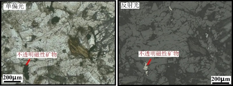 剑川盆地中性火山岩显微照片,不透明磁性矿物属金属矿物,在显微镜单偏光下呈黑色,在反射光下呈亮灰色
