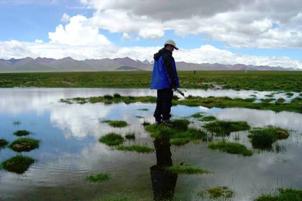 科研人员在藏嵩草占优势的沼泽地调查、取样