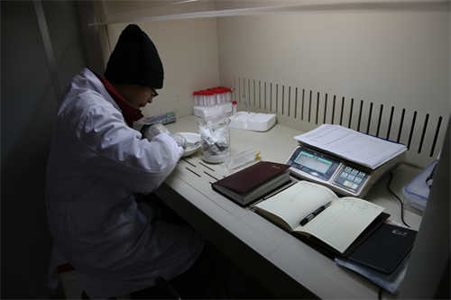 实验以身体上的不适开始。冰芯分样之前有一个流程就是对冰芯进行物理描述,为了避免冰芯融化必须找一个温度较低并且光线较好的地方,记得当时选的地方是在办公楼的背面。冬天的拉萨温差真的很大,阳光照射的地方温暖如春,而在不见阳光的办公楼后面,却是寒风刺骨,记得描述的第一天的只穿了一个羽绒马甲,不到半个小时手脚就完全没有知觉,最后腿都有点疼,后来换了一个大的羽绒服,还是冷的受不了,再后来直接把羽绒马甲穿在大羽绒服里了,好不容易才熬到描述结束。