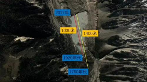 100年,200年呢?米堆冰川过去100年后退了1030米,占据了过去250年的三分之二还多。