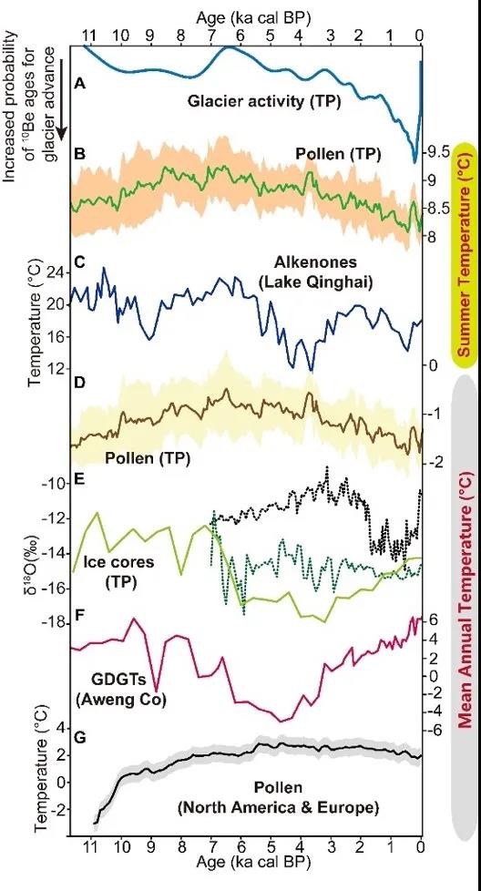 图2 青藏高原全新世夏季温变化(B:孢粉记录集成;C:青海湖长链烯酮记录)、年均温变化(D:孢粉记录集成;E:冰芯;F:阿翁错GDGTs记录)以及冰川活动强度(A)与北半球年均温变化记录(G)对比