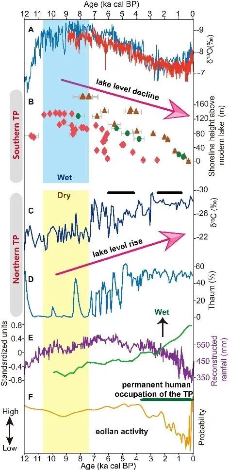 图3 青藏高原南部(B)、北部(C、D)典型湖泊全新世古水位变化与董哥洞石笋氧同位素记录(A)、东亚季风降水变化记录(E:紫色线)、北半球中纬度净降水变化(E:绿色线)、高原东北部风沙活动强度变化(F)对比
