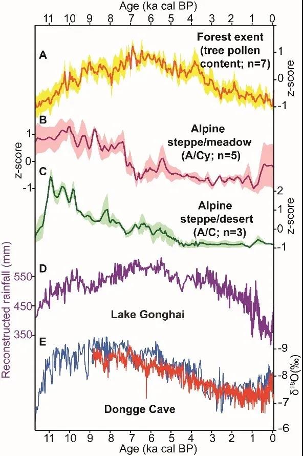 图4 青藏高原全新世植被格局变化(A;B;C)与东亚季风降水记录(D)及董哥洞石笋氧同位素记录(E)对比