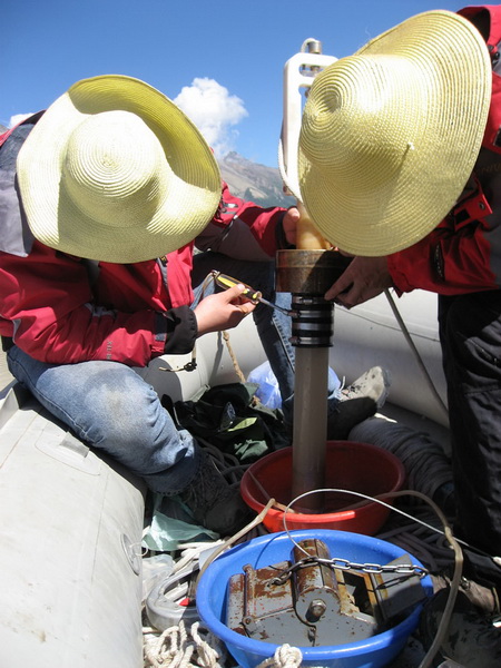 (4)岩芯沉积物样品采集:为全面研究不同湖区沉积速率的差异及恢复近代然乌湖环境变化情况,在考察区域原来15个点的取样基础上,利用重力采样器再次采集了短岩芯2个。