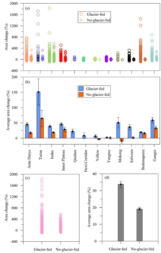 图2. 第三极地区冰川融水补给与非冰川融水补给冰湖变化差异