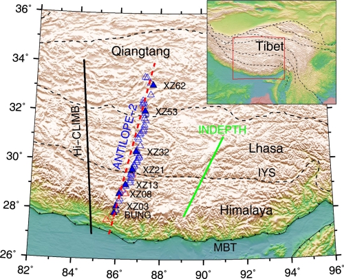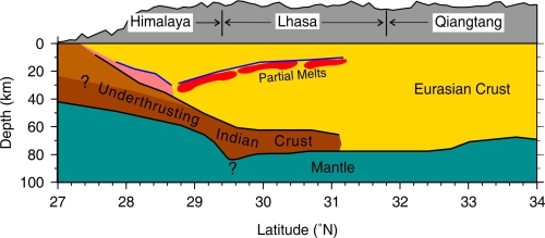 通常认为,印度板块地壳的俯冲引起了青藏高原南部的地壳增厚。已有的研究结果发现了与印度地壳俯冲有关的痕迹,如主边界断裂 (MBT), 主喜马拉雅逆冲断裂 (MHT) 和下地壳存在一个明显的间断面 (Moho doublet)等。但是,没有一条南北向剖面的研究结果能够直接观测到上述的这些俯冲特征。