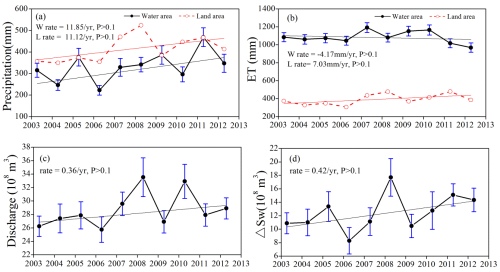 2:色林错湖泊流域的降雨、蒸发、入湖径流及湖泊蓄水量在2003-2012年间的年变化特征。