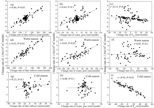 3:色林错湖泊的入湖径流、湖面降雨及蒸发的变化率与湖泊蓄水量的变化率在全年、暖季(5月—10月)、冷季(11月—次年4月)等不同时间尺度上的相关性。