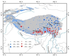 研究结果表明:以帕隆94号冰川为代表的藏东南海洋性冰川近30年来呈现明显的冰量波动变化,上世纪80年代以物质平衡偏正为主,90年代初出现明显的负平衡特征, 后期有微弱正平衡的趋势, 2003年后本区冰川物质平衡发生突变,呈现显著的冰量损失(图1)。通过分析500 hPa位势高度与风场发现:由于青藏高原南北部受不同的反气旋和气旋环流控制,近期印度季风影响下的藏东南地区气候为暖干组合,而高原中北部为相对暖湿的气候组合(图2)。因此相比高原中北部及天山地区冰川(图3),印度季风影响下的藏东南海洋性冰川近期正经历更为显著的冰量亏损。