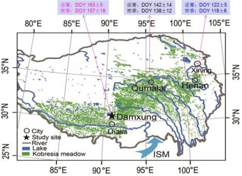 中国科学院青藏高原地球科学卓越中心、青藏高原研究所高寒生态学与生物多样性重点实验室罗天祥研究员课题组,依托中国科学院纳木错多圈层综合观测研究站,基于念青唐古拉山南坡(西藏当雄)海拔梯度实验观测平台的2007-2013年物候观测数据【观测物种:高山嵩草、丝颖针茅、垫状点地梅,7个海拔从草甸下限到上限,每个海拔设自动气象站、围栏和移植实验样地】,并结合已发表的青海曲麻莱和河南农牧站1989-2010年物候观测数据【高山嵩草、羊茅和垂穗披碱草】,发现(图1和图2):1) 嵩草属和针茅属等广布优势物种的返青期与季风雨来临时间同步,对降水变化敏感,但对温度变化不敏感(印度季风爆发时间一般出现在5月底至6月底,这时高原平均气温已经普遍大于0 oC);2) 伴生的垫状植物(其垫状体内有较高温度和湿度)返青期最早且在温暖年份提前,对温度变化敏感,但对降水变化不敏感。研究结果指出,在雨热同期的季风气候效应下,为避免春季低温和干旱胁迫,高寒草地广布优势物种普遍形成一种能感应季风雨来临时间的物候适应策略。在区域上,雨季开始日期及返青前雨量控制高寒草地返青期的时空变化,增温则很可能通过改变降水形态而产生间接影响(图3和图4)。这一新认识解释了青藏高原高寒草甸/草原的扇型分布格局以及返青物候和生产力的时空变化格局,并为理解季风气候变化及其影响范围、古植被演变及西风与季风交互作用等提供了理论基础。