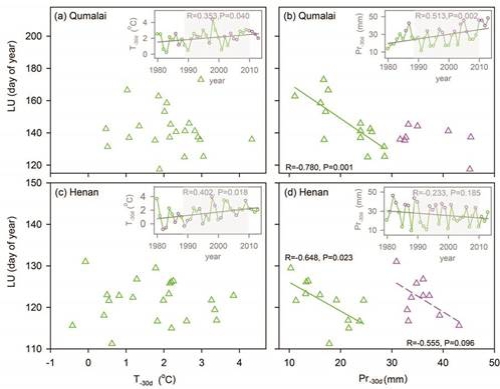 图4. 青海曲麻莱和河南高山嵩草22年的观测数据验证了当雄实验结果,并指出降水形态影响高山嵩草返青期变化及其对气候变化的敏感性