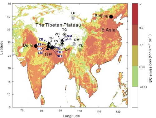 图1 采样点位置(三角代表气溶胶采样点;圆形代表冰川采样点)。背景颜色代表黑碳的排放量。