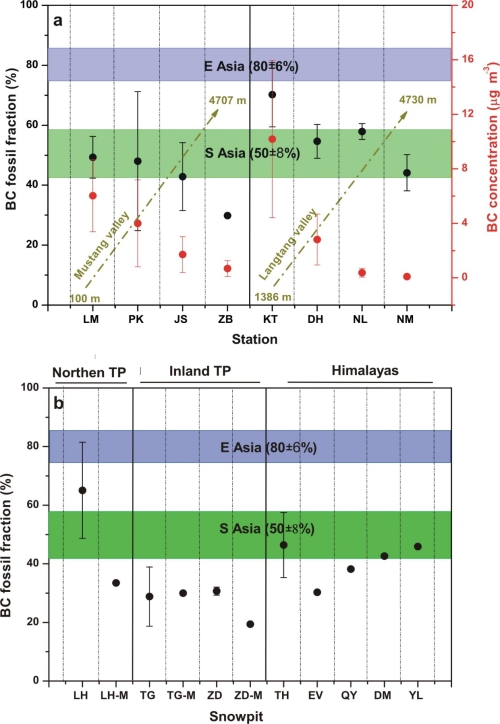 图2 a: 跨越喜马拉雅山脉中部两个断面的大气黑碳含量和化石燃料贡献的比率;b: 雪坑黑碳的化石燃料贡献比率。
