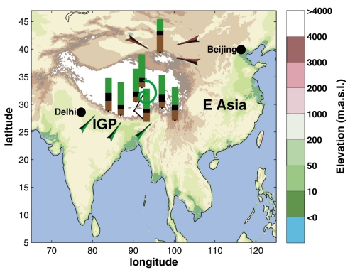 图3 生物质燃料(绿色)、煤(褐色)和液态燃料(黑色)燃烧排放对雪坑黑碳的相对贡献。箭头代表不同区域的黑碳来源。