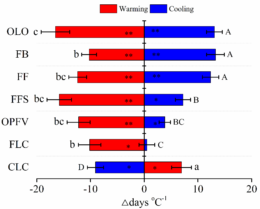 图2 增温和降温下的群落物候温度敏感性变化。OLO: 返青期; FB: 现蕾期; FF: 初花期; FFS: 初果期; OPFV: 果后营养期; FLC: 初黄期 和CLC: 枯黄期。