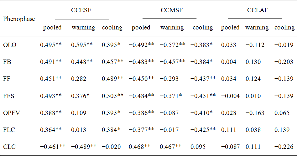 表1 不同花期功能群植物的盖度变化与物候序列变化的相关性。CCESF、CCMSF和CCLAF分别表示早花、中花和晚花功能群植物的盖度变化。Warming为增温(下移),cooling为降温(上移),Pooled为warming + cooling。