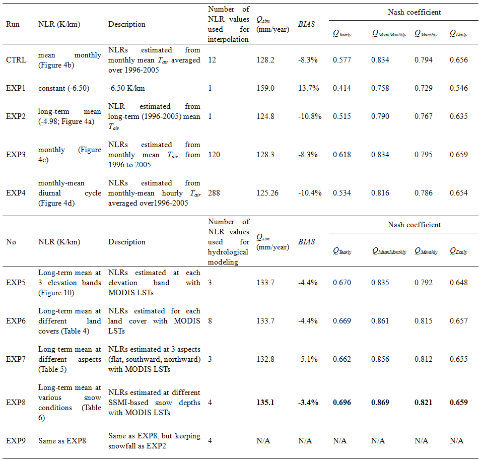 Note: The NLRs in EXP5-EXP9 were derived at the sub-regions of the basin by using MODIS nighttime LSTs, to represent the spatial heterogeneity of NLRs. The other NLRs except those for EXP1 were calculated from the 2-m observations at the 22 CMA stations in the basin.