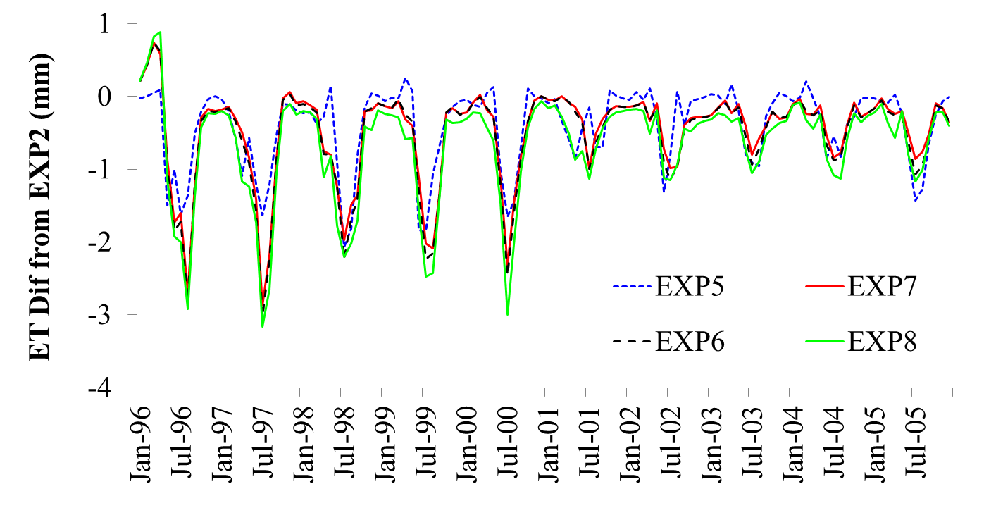 图2. EXP5 -EXP8(考虑NLR的空间变异性)的模拟蒸散发值与EXP2(全流域使用单一的NLR)的区别