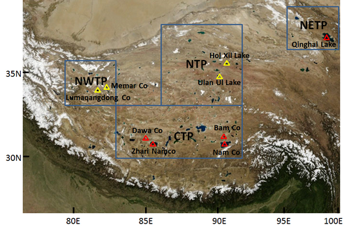 图1 高原西北部,中部,北部,和东北部所选湖泊的位置以及对应的GRACE质量变化的范围