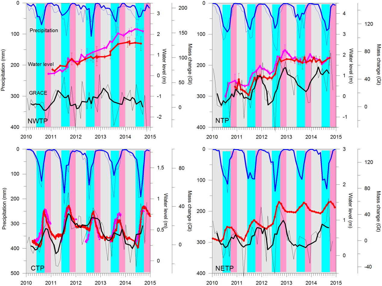 图3 2010-2014年不同区域湖泊水位(中)、月降水(上)和GRACE区域总质量变化(下)的对比。绿色方框代表每年6-9月,浅红色方框代表每年10-12月。