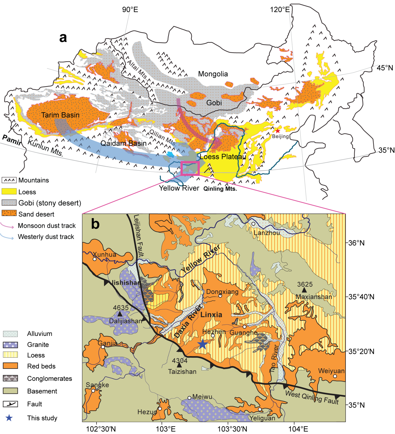 图1 我国北部现代风尘沉积物分布(a)和临夏盆地及邻区地质图(b)。