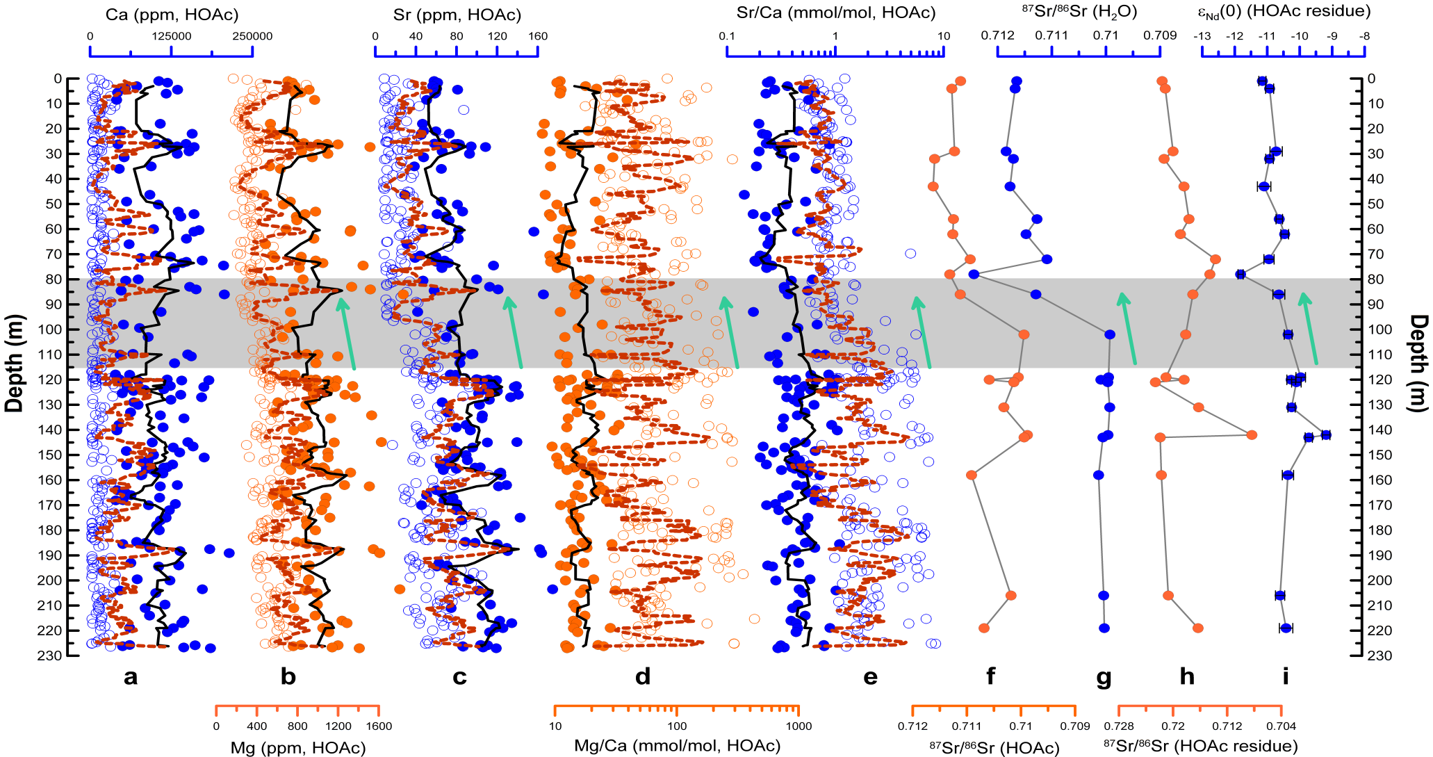 图2 临夏盆地黑林顶剖面各类地球化学指标随深度变化。H2O、HOAc、HOAc residue分别代表水溶组分、醋酸溶解组分和醋酸不溶组分。80-116m的灰色条带显示了~8Ma前后各类指标的系统改变。