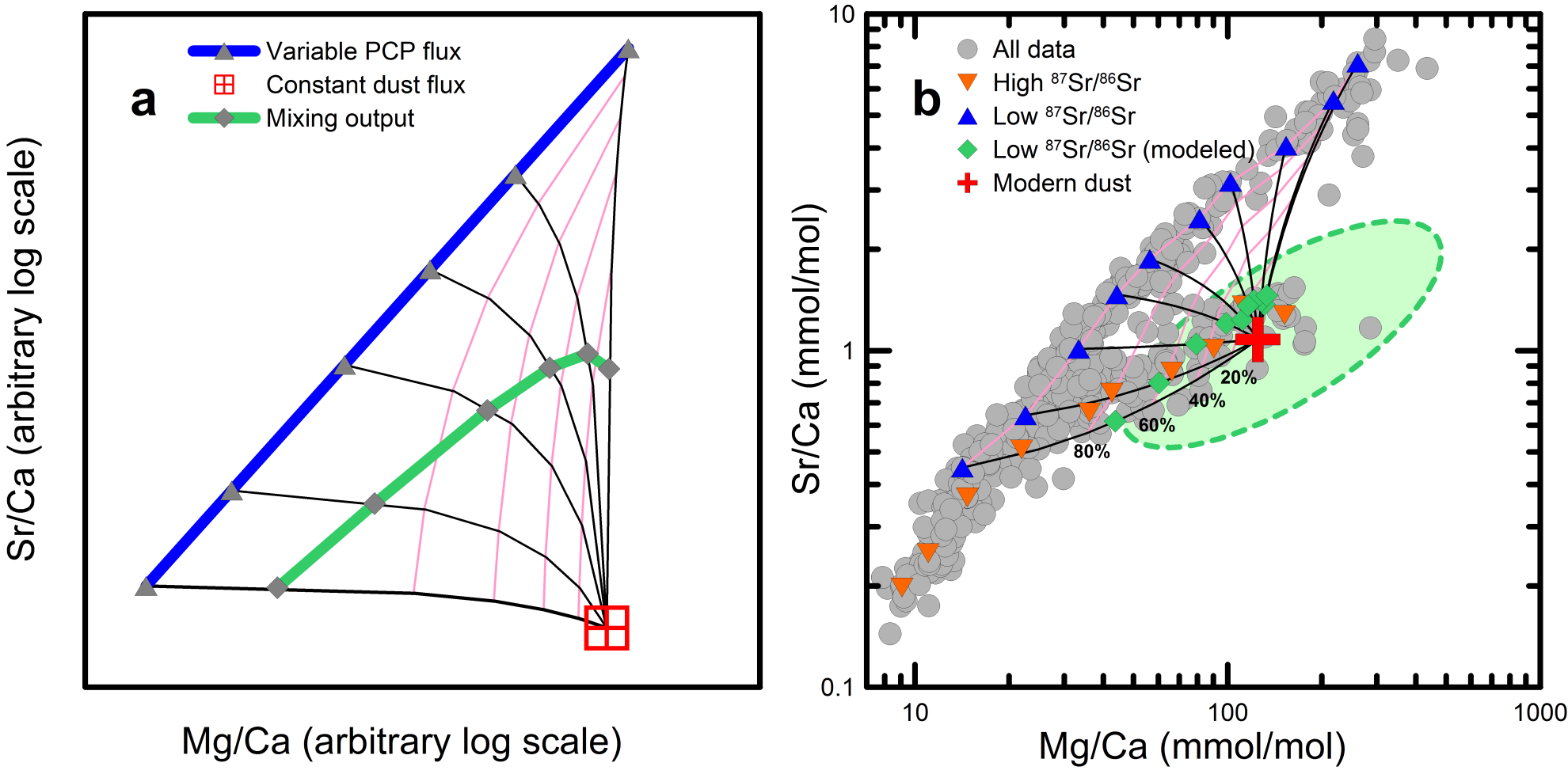 图3 (a)变化的典型的方解石沉淀PCP (prior calcite precipitation) 通量与稳定的粉尘输入通量混合的概念模型。(b)黑林顶剖面碳酸盐组成Mg/Ca-Sr/Ca的粉尘输入验证。