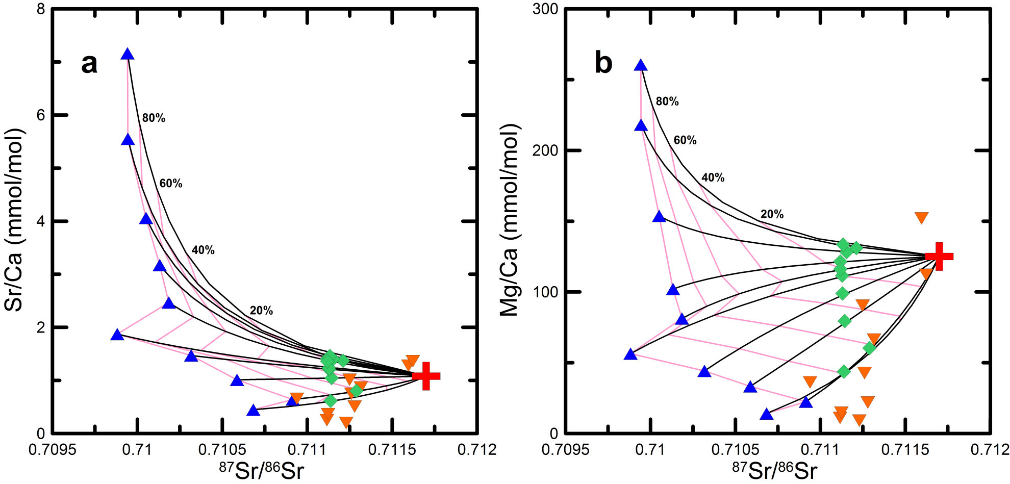 图4 黑林顶剖面碳酸盐组成Sr/Ca-87Sr/86Sr(a)和Mg/Ca-87Sr/86Sr(b)的粉尘输入模型验证。