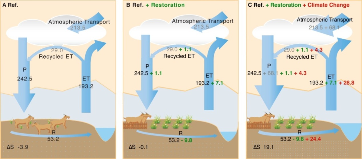 基于此,中国科学院青藏高原研究所,青藏高原地球科学卓越创新中心汪涛研究员课题组(博士后李佳和刘丹为本研究的共同第一作者),联合中国科学院西北高原生物研究所和澳大利亚CSIRO Land & Water等单位研究人员,根据长江源直门达水文站径流观测,结合气象和卫星遥感资料,发现草地生态工程(Figure 1)导致了丰水期产流系数的显著降低(Figure 2)。通过进一步利用高寒草地生态系统长期围栏封育试验、Budyko水热耦合平衡理论和区域水汽再循环模型WAM-2layers,量化分析了草地生态工程和气候变化对长江源区关键水文过程变化(径流、蒸散发和土壤水源涵养能力)的影响(Figure 3)。结果显示:草地生态工程显著促进了地表蒸散发过程,起到了减少丰水期径流的作用,其减少量约占丰水期平均径流量的16.4%;其次,通过本地蒸散发再循环过程,草地生态工程有利于区域降水的形成,进而增加径流,但其增加量不足以弥补蒸散发增强引起的径流减少;再者,不同于过去干旱和半干旱地区的造林工程,草地生态工程提高了土壤水源涵养能力,这一结论得到站点水平长期围栏封育试验的证实;最后,值得注意的是,草地生态工程实施以来,大气环流变化引起了降水增强,从而增加了径流量,抵消了由生态工程导致的径流减少,因此长江源直门达水文站观测的径流量仍然表现为增加趋势。