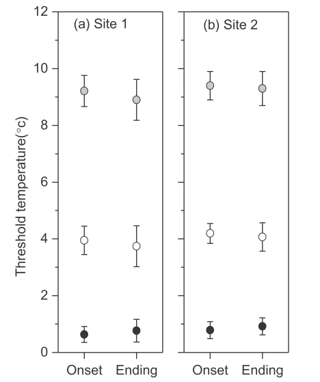 图2.藏东南两个天然急尖长苞冷杉树线样点木质部分化开始、结束对应的大气最低(黑点)、平均(白点)及最高(灰点)温度阈值(平均值±标准差,样本量=5)。