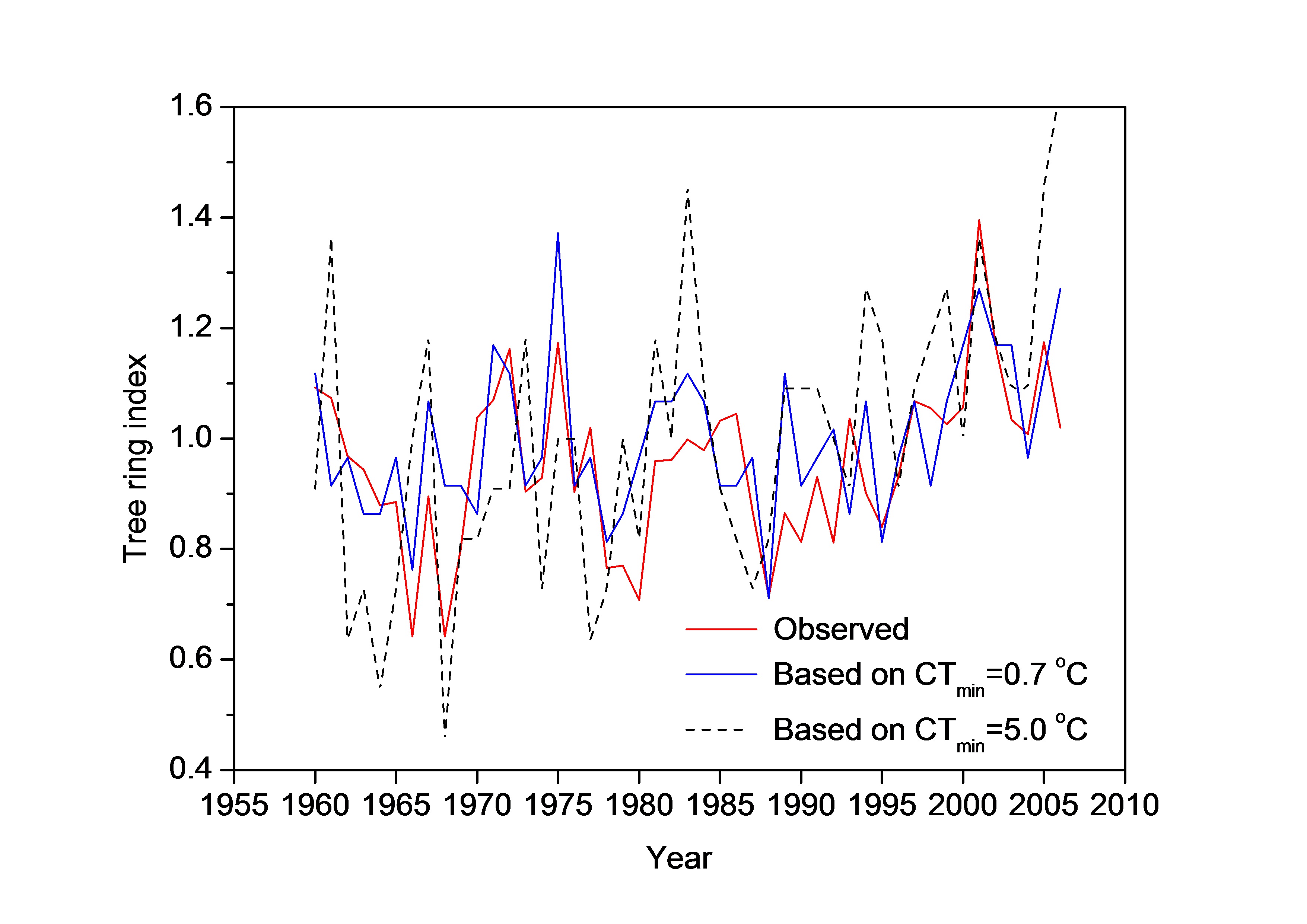 图3.实测(红线)与模拟的藏东南急尖长苞冷杉林线1960-2006年的树轮宽度指数序列。Vaganov-Shashkin树木生理模型采用0.7℃阈值(蓝线)模拟的轮宽指数与实测数据相关系数可达0.66(p<0.01),而采用5℃阈值(虚线)模拟的相关结果仅为0.41(P<0.05)。