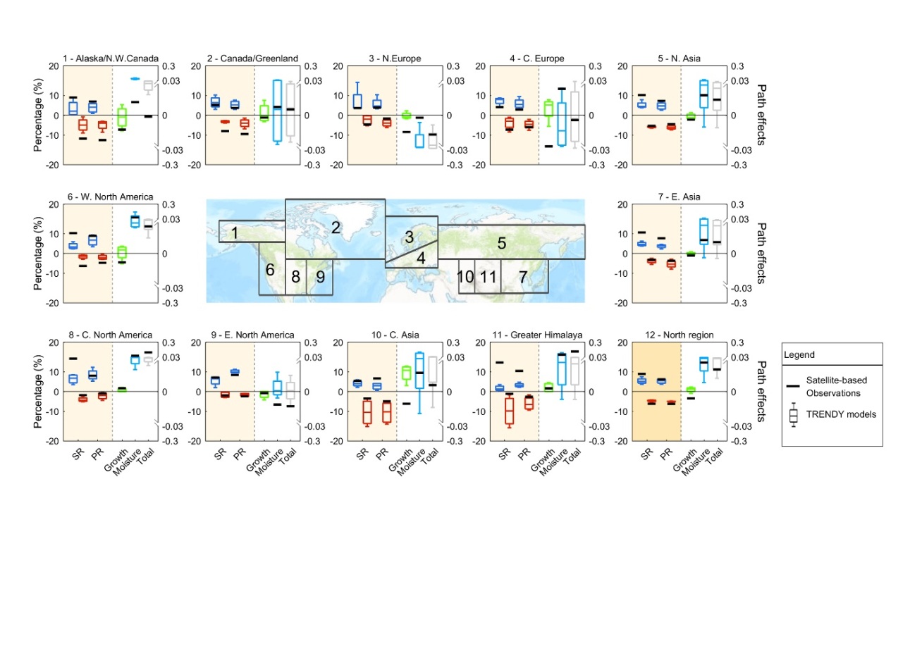 最近,中国科学院青藏高原地球科学卓越创新中心、青藏高原研究所汪涛研究员课题组(博士后王晓昳为第一作者),基于卫星遥感大尺度观测和多种不同生态系统过程模型,系统分析了高寒区域植被生长对积雪变化的响应格局及其成因。研究发现,积雪对植被生长的影响具有明显的区域分异,这可归结为主要生态过程对积雪-植被关系调控的相对重要性:积雪的土壤水分效应(一般表现为积雪多—水分多—植被变好;正的促进效应)和积雪对物候期的影响(一般表现为积雪多—春季物候推迟—植被变差;负的抑制效应)(图1)。在第三极和北美的中西部,积雪的土壤水分效应起了主导作用,因此积雪对植被生长的影响主要表现为正的促进作用;而在欧洲中部,由于积雪对物候期的影响起着决定性作用,因此积雪对植被生长主要表现为负的抑制作用(图2和图3)。
