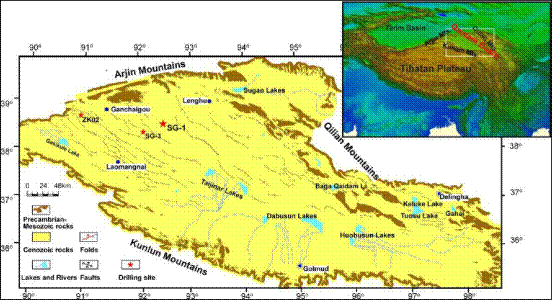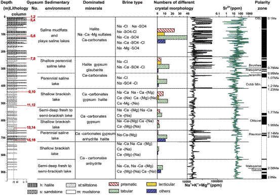 石膏是一种析出较早、在地层中能够长期稳定存在的盐类矿物。柴达木盆地西部SG-1钻孔(孔深为938.5m,古地磁年代为2.77Ma-0.1Ma)中,石膏作为第二大盐类矿物,其沉积连续、时间跨度大、保存状况良好,是进行干旱气候条件下湖泊沉积中石膏形态学和地球化学研究的理想材料。