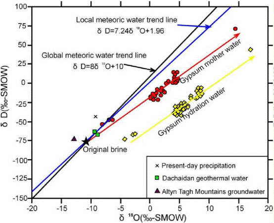 图3 SG-1钻孔石膏结晶水的氢氧同位素线