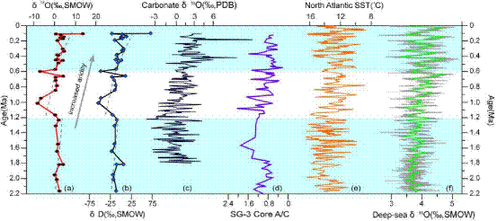 石膏结晶水氧同位素最低值为-6.18‰,最高值为17.78‰,氢同位素最低值为-72.77‰,最高值为49.73‰,δD-δ18O呈线性关系,斜率为5.39,与大气降水线明显不同,说明石膏是在蒸发作用下从溶液中直接析出的,形成环境比现代气候湿润,且析出后未受后期大气降水的影响。虽然部分石膏经历了早期成岩作用,但依然保留了原生湖水或孔隙水的环境信息。氢氧同位素的变化显示,~2.2Ma以来研究区气候总体呈寒旱化趋势,其中1.2Ma寒冷加剧,1.0-0.9Ma温度最低,0.6Ma开始进入极端干旱环境。