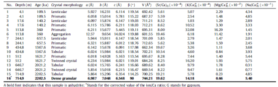 中国科学院青藏高原研究所李皎博士和李明慧副研究员及其合作者高密度地挑选了钻孔中的石膏,详细地研究了石膏矿物学和结晶水的稳定同位素特征及其环境意义,研究发现:SG-1钻孔中的石膏形态有扁平状、柱状、透镜状、双晶、玫瑰状、碎屑状晶体等,同种形态的石膏可以出现在不同的沉积环境中,同一种环境下也出现了形态不同的石膏。石膏形态变化的主要影响因素是湖水盐度、盐类离子种类和含量变化,如K、Na、Mg、Sr等,这些离子对石膏晶面生长具有选择性抑制作用。