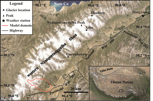 在过去两百多万年的第四纪历史时期内,高原及其周边山地的冰川在冰期与间冰期气候旋回的背景下发生前进和后退。与现代冰川研究相比,研究第四纪冰川对高原气候在较长时间尺度上对全球变化的区域响应方面具有明显的优势,因而青藏高原冰川一直受到国际第四纪冰川研究者的广泛关注。青藏高原冰川区丰富的冰川遗迹(冰川侵蚀地貌和沉积地貌)是过去冰川时空演化最直观的证据,通过研究这些遗迹恢复出古冰川的期次、规模可为重建青藏高原冰期气候环境以及认识高原对全球气候的响应机制提供科学的依据。目前青藏高原的冰川地貌学年代学研究已广泛开展起来,这些年代学研究成果为古冰川的定量重建打下坚实的基础。古冰川-气候的模拟模型研究提供了一种可靠的定量重建古冰川以及从冰川地貌本身直接推断冰期古气候的手段,这些研究工作在青藏高原也已经逐步开展起来,为高原上古冰川对气候响应的敏感性以及古冰川的规模(尤其是体积)的恢复提供了关键证据。我所易朝路课题组(许向科副研究员为第一和通讯作者)利用耦合的冰川物质平衡和流动模型在念青唐古拉山西段南坡的四条冰川谷地内开展了冰川对气候敏感性以及末次冰期时两次冰川前进的模拟工作(图1)。