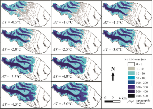 图 2 冰川-气候模型模拟温度从0.5°C降到5°C,冰川变化情况