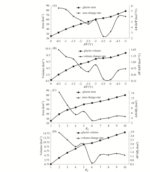 该研究主要结论有:在逐步降温的条件下模拟冰川的变化(图2),温度降低<2°C,该区内冰川类型为山谷冰川;>3°C为山麓冰川类型;2-3°C为过渡类型(宽尾冰川)。冰川的面积和体积对温度和降水变化不是线性的(图3),这种非线性关系受到地形的控制。如降水不变,达到末次冰期盛冰期(LGM)和MIS3中期冰川规模需要温度分别降低2.3°C,3.2°C;LGM时降水是现在的30-70%,温度比现在下降2.9-4.6°C;MIS3时降水比现在的多40-100%,温度比现在下降1.8-2.5°C。