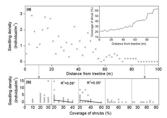 图2. 冷杉幼苗密度随着与林线距离的增加而降低(a),杜鹃灌丛盖度随着与林线距离的增加而增加(a,插入图),但幼苗密度与灌木盖度的相关性很弱(b)。
